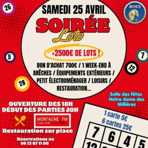 Le club de football ASHCS organise une soirée loto le samedi 25 avril 2026 à la salle des fêtes de Notre-Dame-des-Millières. Réservations au 06 13 87 11 00