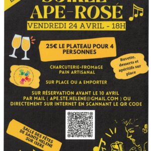 L’association des parents d’élèves de Sainte-Hélène-sur-Isère organise une soirée Apé-rosé le vendredi 24 avril 2026 à partir de 18h. Entrée libre.